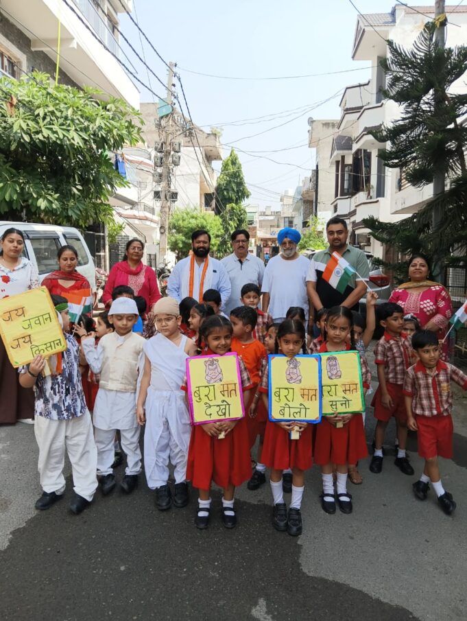On the occasion of Gandhi Jayanti, a vibrant peace rally was organized in the Bakshi Nagar area, led by Gourav Anil Chopra, Former Corporator and contesting candidate for MLA Jammu West. He was joined by Sh. Sanjay Verma Ji and Sh. Jaspal Singh Ji, along with the enthusiastic participation of the staff and children of Rich Heritage School. Chanting patriotic slogans and carrying messages of unity, the children marched through the streets, drawing admiration from local residents. Gourav Anil Chopra emphasized the importance of instilling national values in the younger generation and thanked the participants for their support.